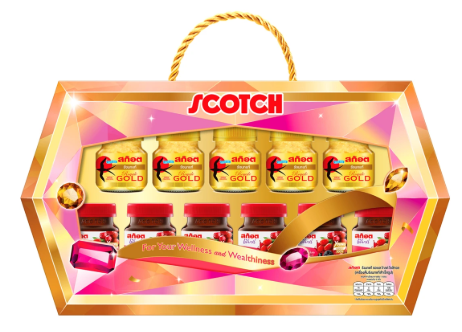 ในกระเช้าประกอบด้วย สก๊อต รังนกแท้ รอเยล โกลด์ ไซลิทอล 40 มล. 5 ขวด และสก๊อต เพียวเร่ เบอร์รี่ สกัดเข้มข้น 40 มล. 6 ขวด